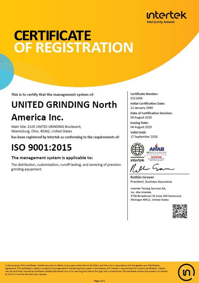 Being a top leader in the manufacturing of precision grinding machines, UNITED GRINDING North America achieved certification to ISO 9001.